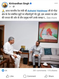 बहराइच। गोण्डा सांसद विदेश राज्य मंत्री कीर्ति वर्धन सिंह ने रेल मंत्री अश्वनी वैष्णव से मुलाकात कर रेलवे से संबंधित कई मुद्दों पर रेल मंत्री से बात की।